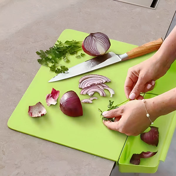 Utrzymuj blaty w nieskazitelnej czystości! Wbudowany schowek zbiera resztki i posiekane kawałki, eliminując typowy kuchenny bałagan.