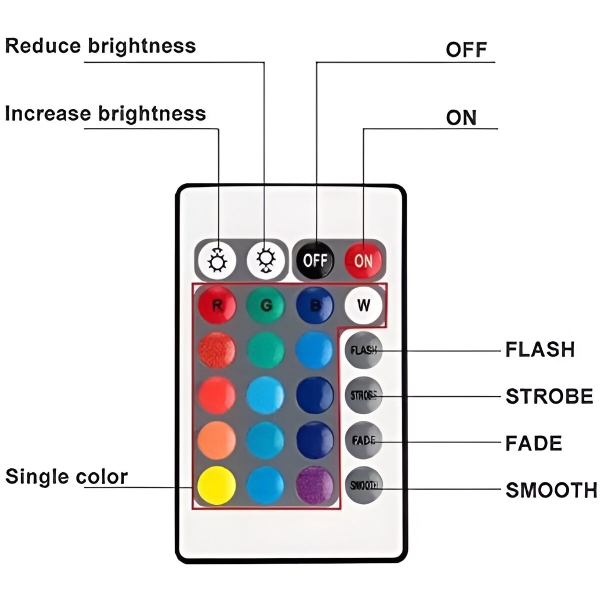 AQUASHEIN są wyposażone w wygodny pilot zdalnego sterowania, który umożliwia łatwą regulację oświetlenia. Dzięki 24 przyciskom można wybierać spośród 16 kolorów RGB i czterech trybów dynamicznych (miganie, stroboskop, zanikanie, płynne przejście). Kontroluj światła z odległości do 10 metrów, zapewniając bezproblemową personalizację.