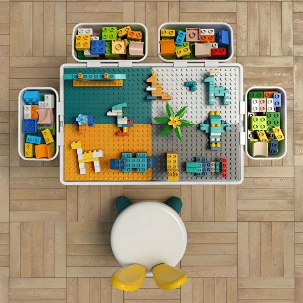 Stolik może być używany z obu stron, przy czym jedna strona jest przeznaczona do układania klocków, a druga ma płaską powierzchnię.